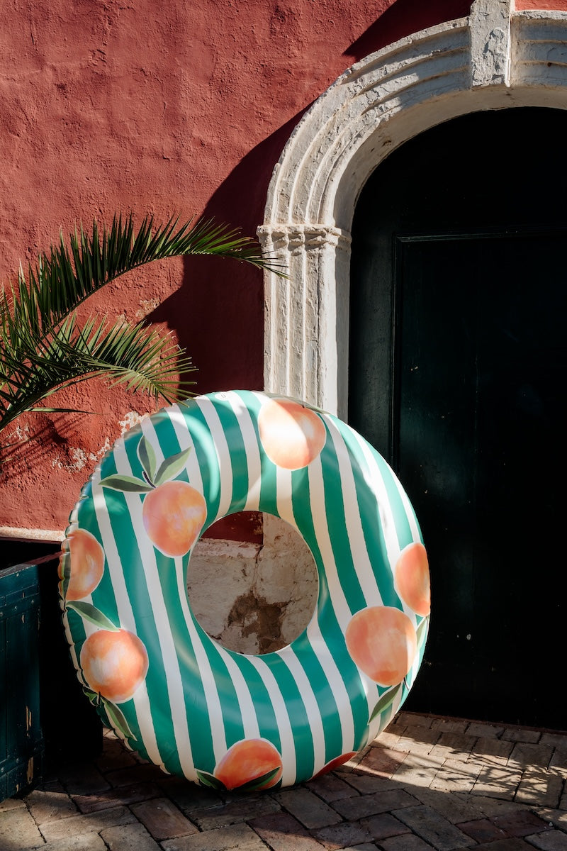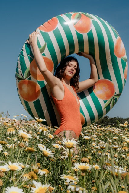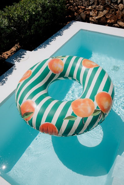 Grande bouée ronde gonflable de 1,20 m de diamètre au motif avec des rayures aquarellées couleur terracotta corail et de jolies oranges.